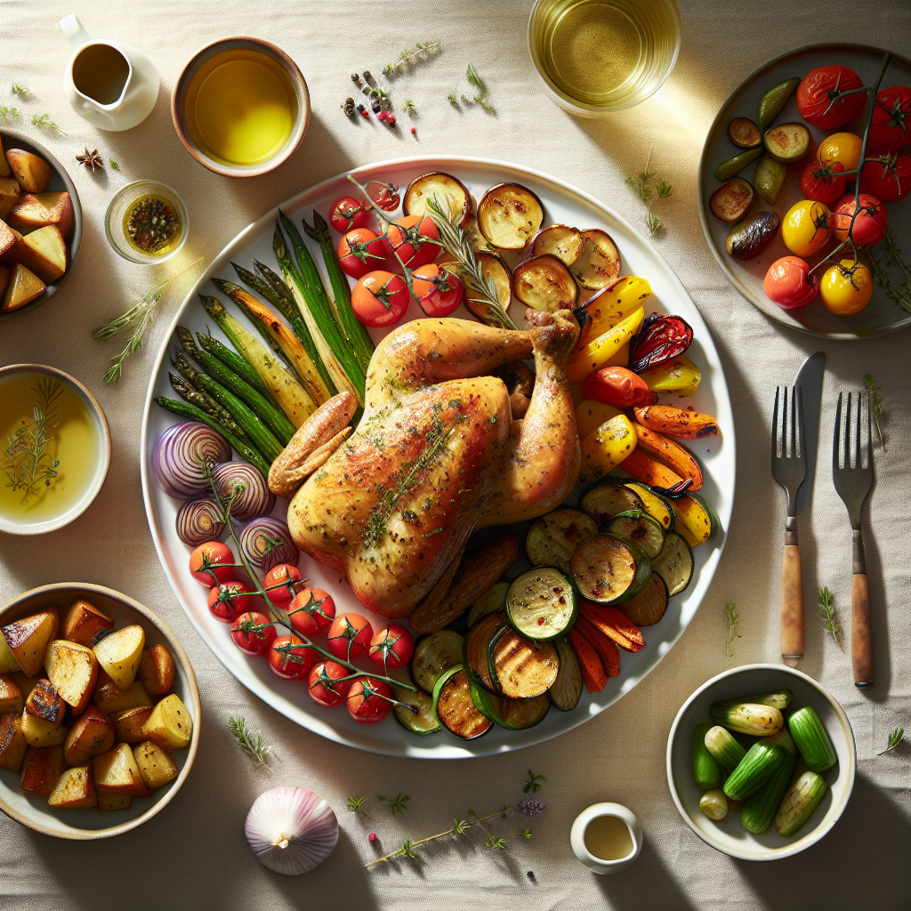 A flavorful Italian dish featuring herb-marinated chicken served alongside a colorful array of roasted vegetables, perfect for a family meal.